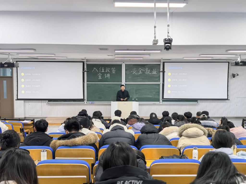 随后,开展征兵入伍专项宣讲,详细介绍毕业生入伍政策、报名流程、优抚待遇及职业发展优势,鼓励符合条件的同学响应国防号召、投身军旅建设。国际交流合作处葛老师带来留学申请专题讲座,围绕留学时间规划、材料准备、院校及专业选择等实用内容进行分享,为有意向出国深造的同学提供针对性指导。