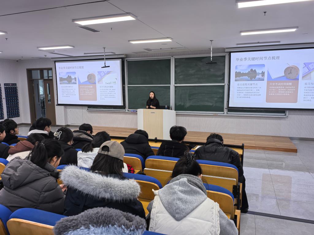 于致知楼B102教室组织召开"安全度假,蓄力冲刺——毕业生寒假成长规划暨安全提醒会"主题班会。学院党委副书记季中主持会议,毕业班辅导员李祥敏作专题讲解。会议同步开展征兵入伍政策宣讲,并邀请国际交流合作处葛宏飞老师进行留学申请指导。学院全体毕业生参加本次会议。