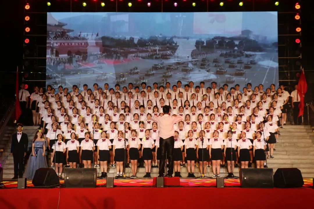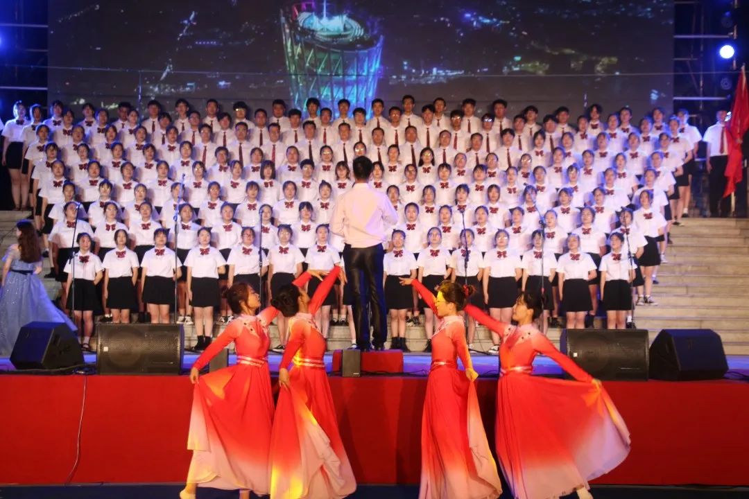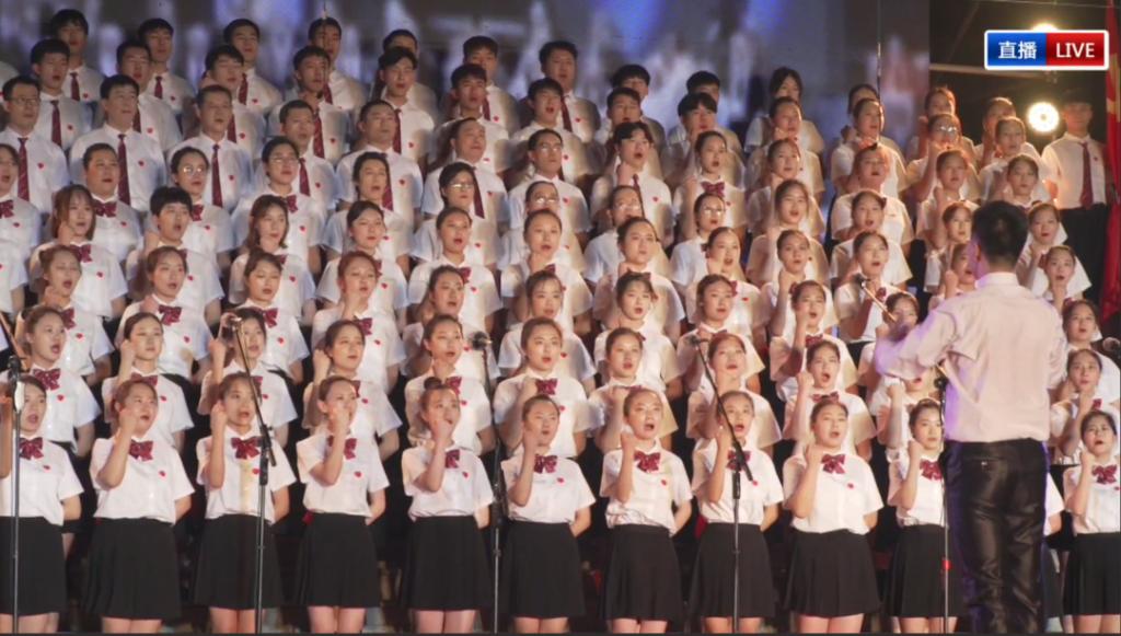 的师生们整齐划一,精神抖擞的站在舞台的中间。音乐响起,指挥双手一撒,嘹亮的歌声唱响整个夜空。两首经典的老歌《走向复兴》,《在灿烂的阳光下》,它们承载着太多的民族感怀和时代记忆,讴歌了中国共产党带领中华民族走向伟大复兴的使命担当。最终,经过评委会现场评定,动漫a片
