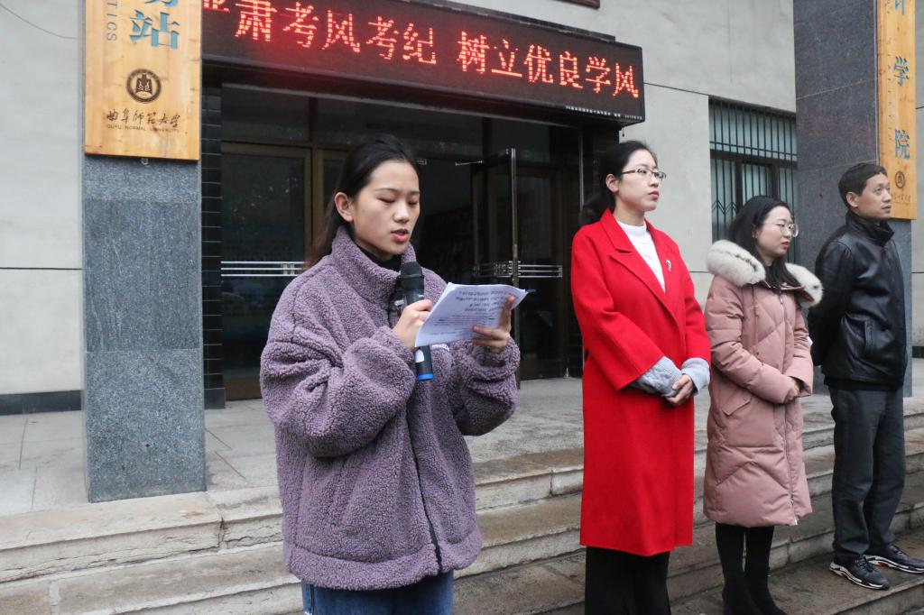 大会由17级辅导员李宴美主持。首先,胡锋老师宣读了考试纪律以及作弊惩罚条例,积极引导学生遵守考试纪律。紧接着,学生代表李克欣同学宣传诚信考试倡议书并带领全体同学宣誓,杜绝各种作弊行为,抵制各种不良考风,共同营造诚信考场。随后,党委书记刘明海做讲话,他要求全体同学做有诚信有道德的大学生,他希望全体同学都能严格遵守学院纪律,诚信备考。最后,李宴美对老师大会进行总结陈词,再次强调遵守考场纪律的重要性。