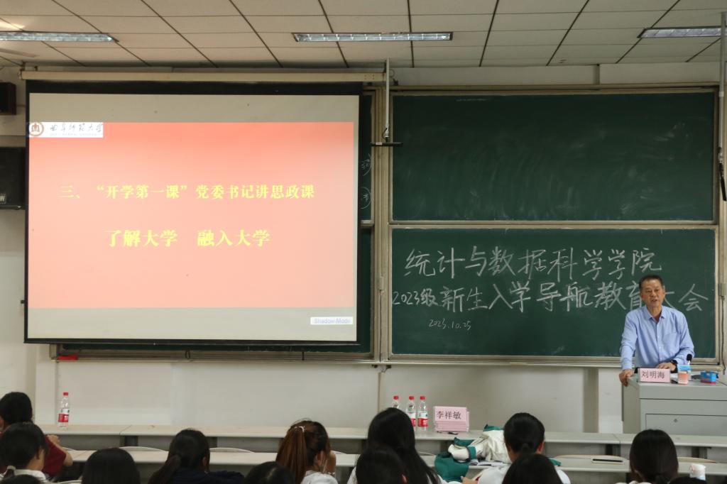 最后,刘明海书记向2023级全体新生讲思政课,题目为“了解大学,融入大学”。课堂上,刘书记强调大学与中学的学习不同以及大学对同学们的意义,希望各位同学早日适应大学生活、树立远大目标,在大学中丰富自己的知识储备,为踏入社会打好基础。语重心长教育引导新生感恩祖国、感恩父母、敬畏生命、热爱生活,希望同学们能够追求远大理想,不负青春韶华。