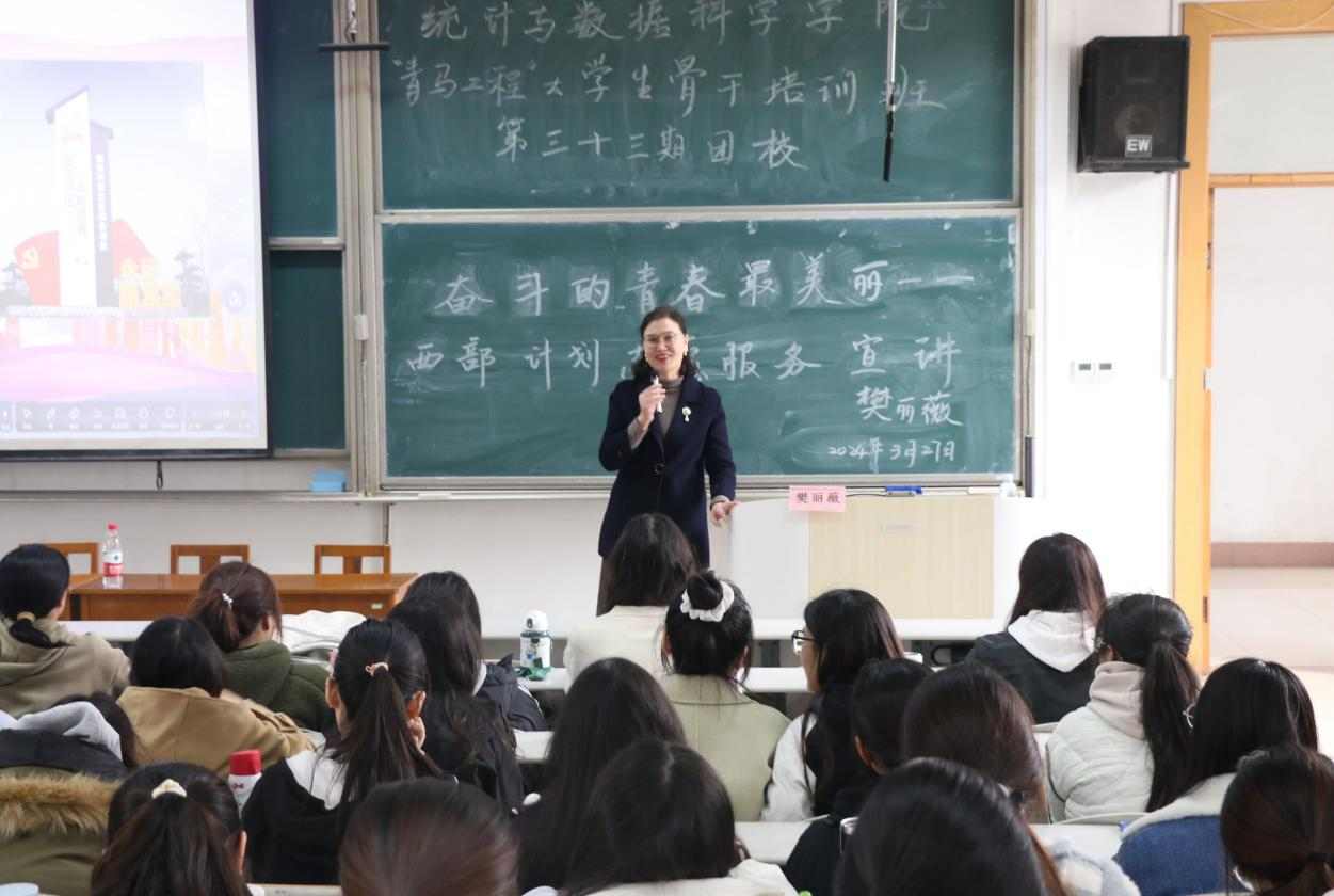 于3月27日下午两点在综合楼206教室举办“青马工程”大学生骨干培训班暨第三十三期团校培训第三课。本次青马课以“奋斗的青春最美丽——西部计划志愿服务”为主题。本次课程邀请经济学院2009级校友时庄街道团工委书记樊丽薇主讲,动漫a片
