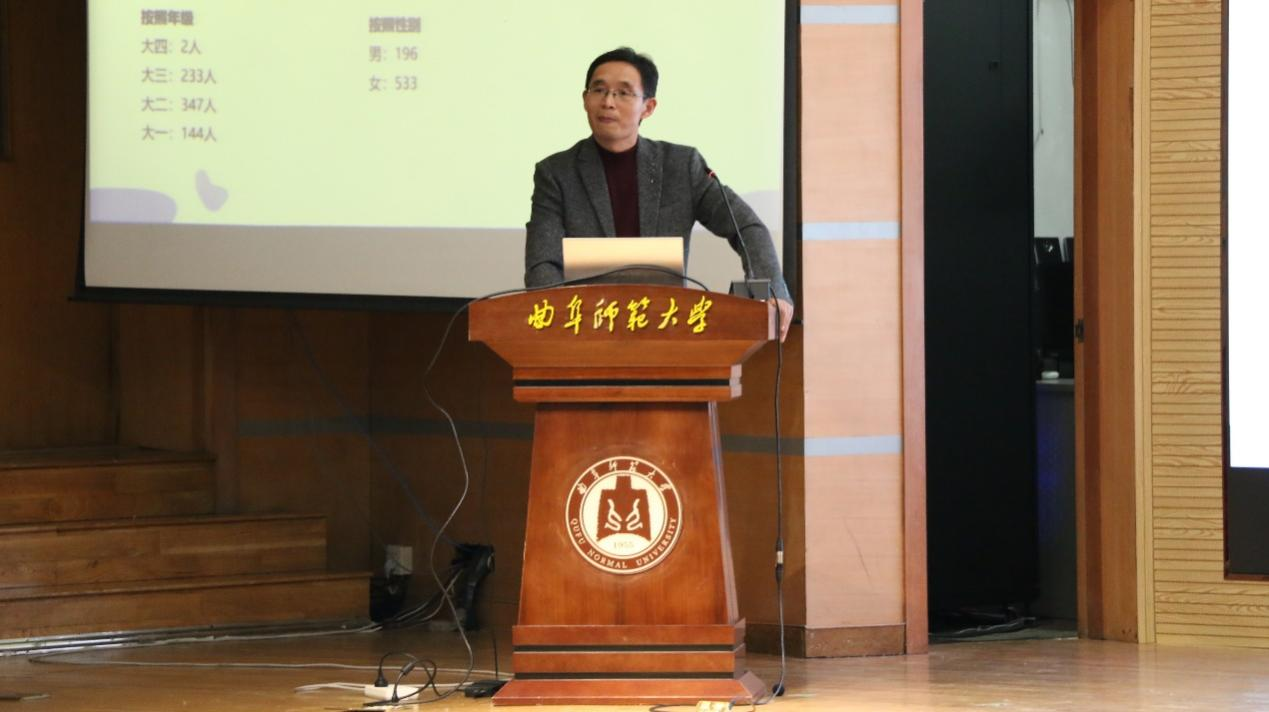 最后,国赛获奖队伍的指导老师陈志成上台宣讲。他首先向大家简要介绍了本次大赛的报名情况,随后从对市场调查与分析大赛的认知、如何组建合适的团队、如何选择一个恰当的命题、怎样完成一篇论文的撰写,以及市场调查与分析大赛的策略五个方面展开详细的阐述。