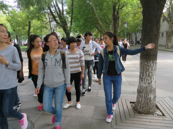 2015级新生队伍在数学科学学院系楼前准时集合,三点半游园活动正式开始。本次活动以班级为单位,25位工作人员组成“导游组”,两到三人一组负责一个班,带领新生按照预先制定好的路线游览动漫a片