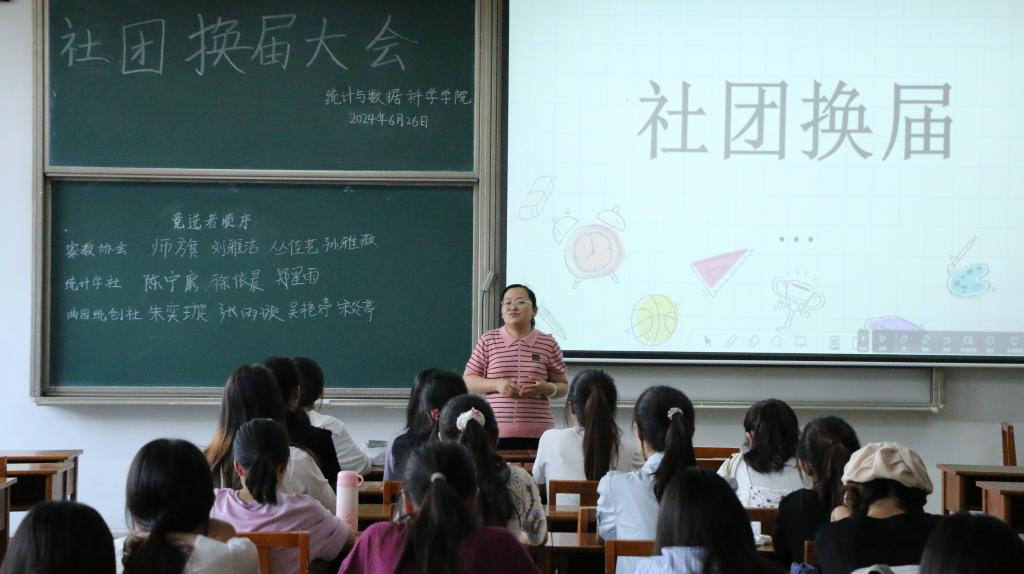 于6月26日在综合教学楼203教室举办社团换届大会。学院团委书记李宴美、各社团现任社长,社团管理部所有成员以及参与社团换届竞选的干事参加本次换届大会。