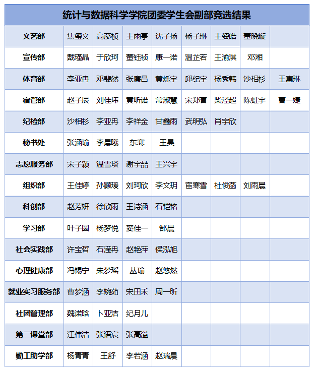 于2025年9月14日在老文史楼固定教室有序开展团委学生会副部长竞选工作。本次竞选严格遵循“公平、公正、公开”的核心准则,经综合评定后确定最终副部长人选。现将竞选结果予以公示,具体名单如下: