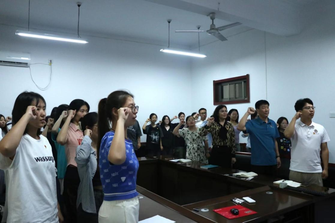 随后,全体党员进行党员宣誓,学院的领导为新发展党员佩戴党徽。在自由交流发言环节,发展党员代表徐菲悦和陈珺分享了她们在党组织关怀下的成长经历和心得体会,强调了党员的责任和使命,以此增进共识,让大家感受到作为一名党员的坚定信念和担当精神。