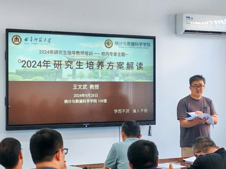 会议在下午3点准时开始,首先由王文武老师结合当前的学科建设和研究生培养现状,深入解读了2024年研究生培养方案。王文武老师还强调:导师要留住学生,专硕需完成论文开题及大部分内容后方可实习,鼓励学生多参与比赛,每人至少参加两次。此举旨在提升学生实践能力,确保学业与实习平衡,促进学生全面发展,以提升学生的综合竞争力。
