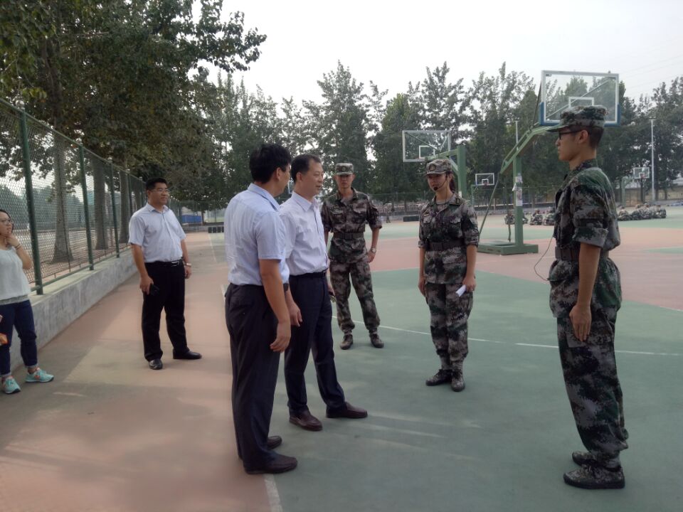 党委书记刘明海,党委副书记季中,辅导员吴雷、李玲,辅导员助理吕珊珊一行,来到学校西篮球场看望了正在军训的2017级本科新生。